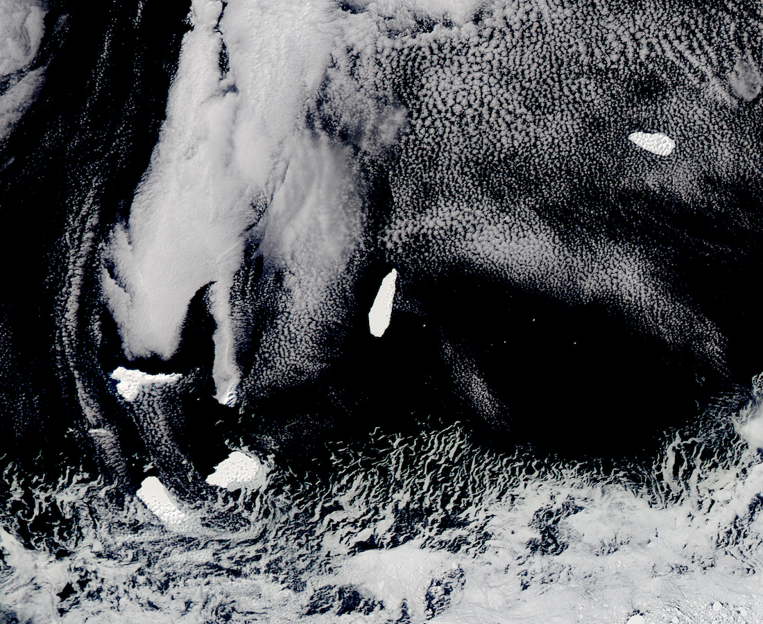 Today’s Image of the Day comes courtesy of the NASA Earth Observatory and features a look at 4 different icebergs drifting across the Southern Ocean.