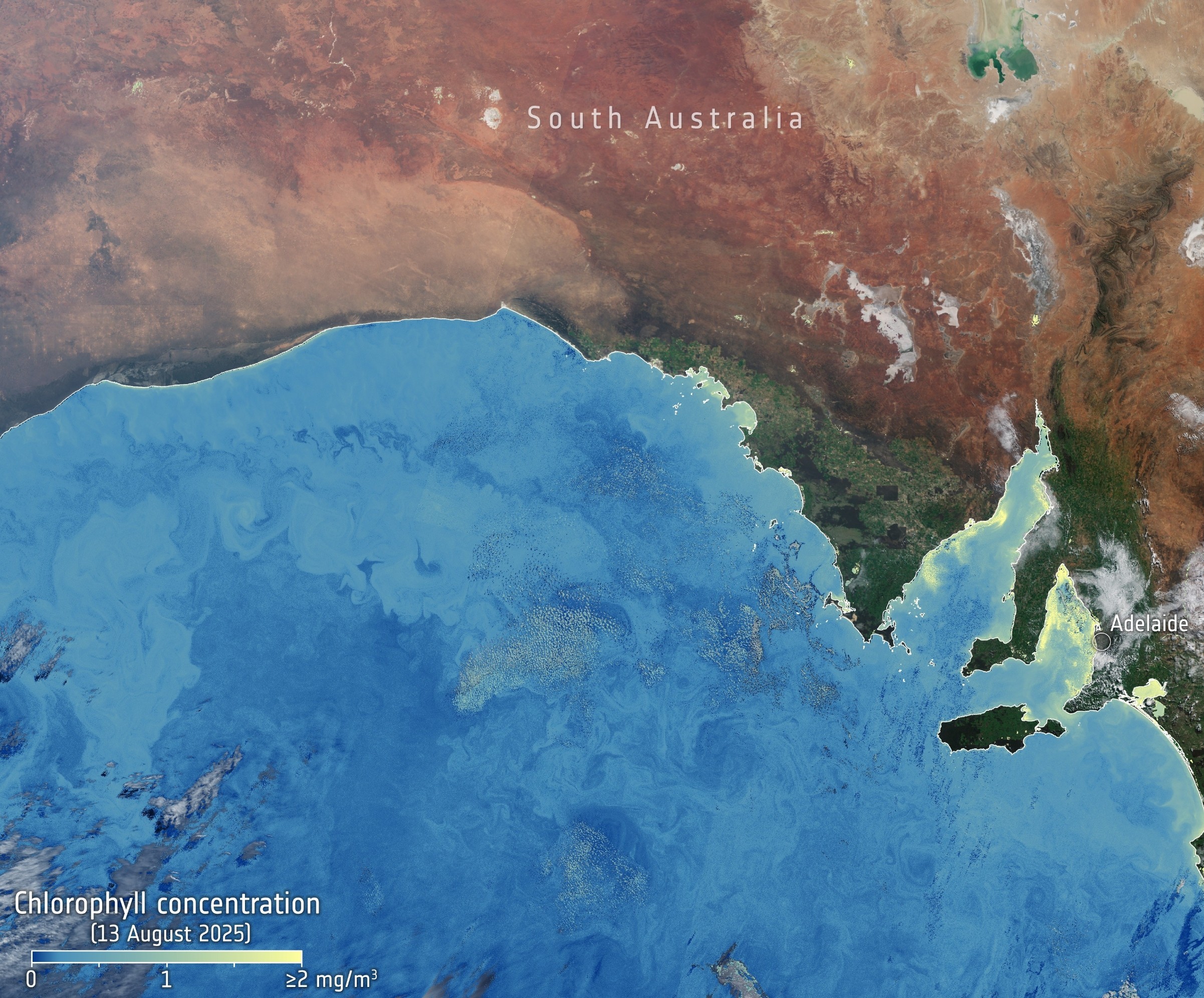 Today’s Image of the Day from the European Space Agency features a persistent algae bloom along the coastline of South Australia near Adelaide. For more than five months, the waters have been marked by the unusual phenomenon.