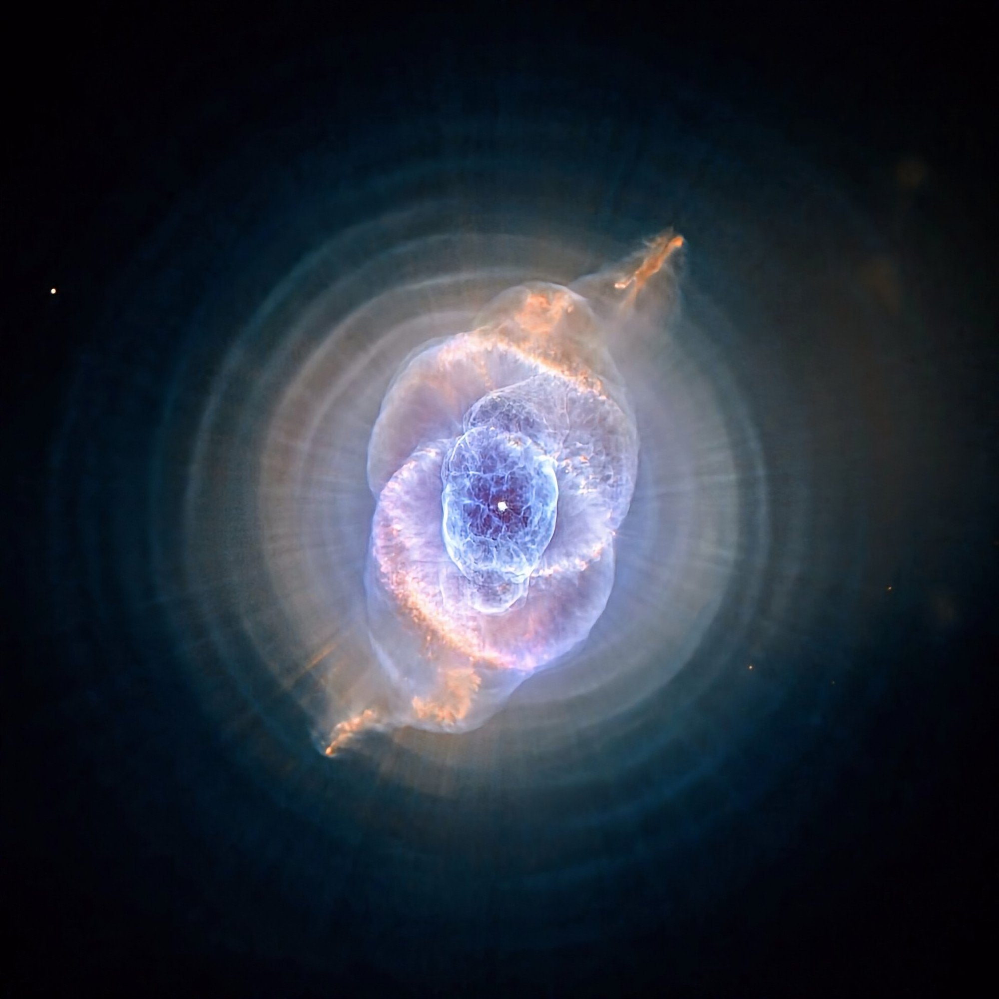 “This image, taken with Hubble’s Advanced Camera for Surveys (ACS), reveals the full pattern of eleven or more concentric rings, or shells, around the Cat’s Eye. Each ‘ring’ is actually the edge of a spherical bubble seen projected onto the sky – which is why it appears bright along its outer edge.”