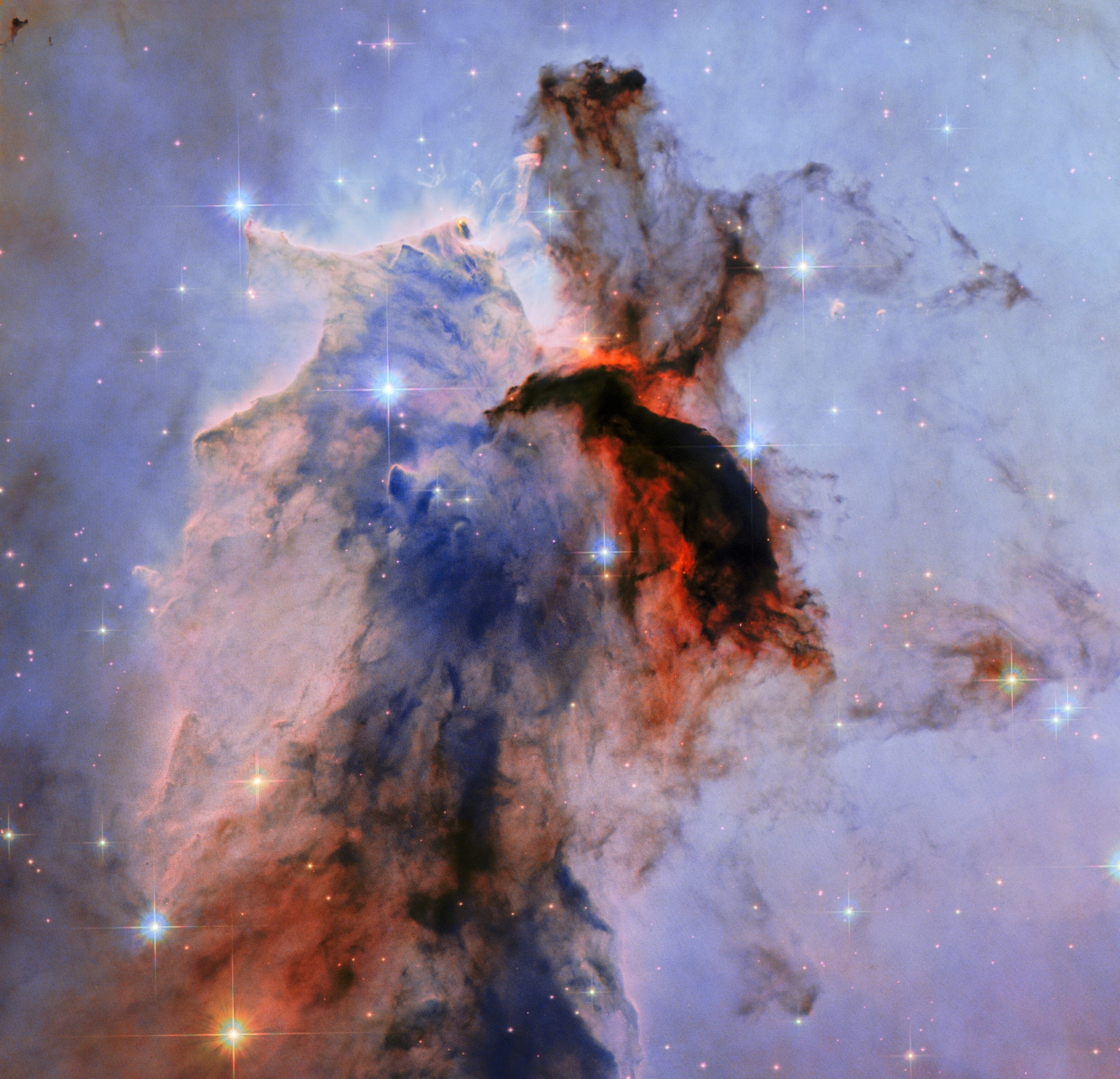The thick material in the pillar blocks most light, appearing dark and heavy against the backdrop. However, its edges glow where light from the more distant nebula shines through.