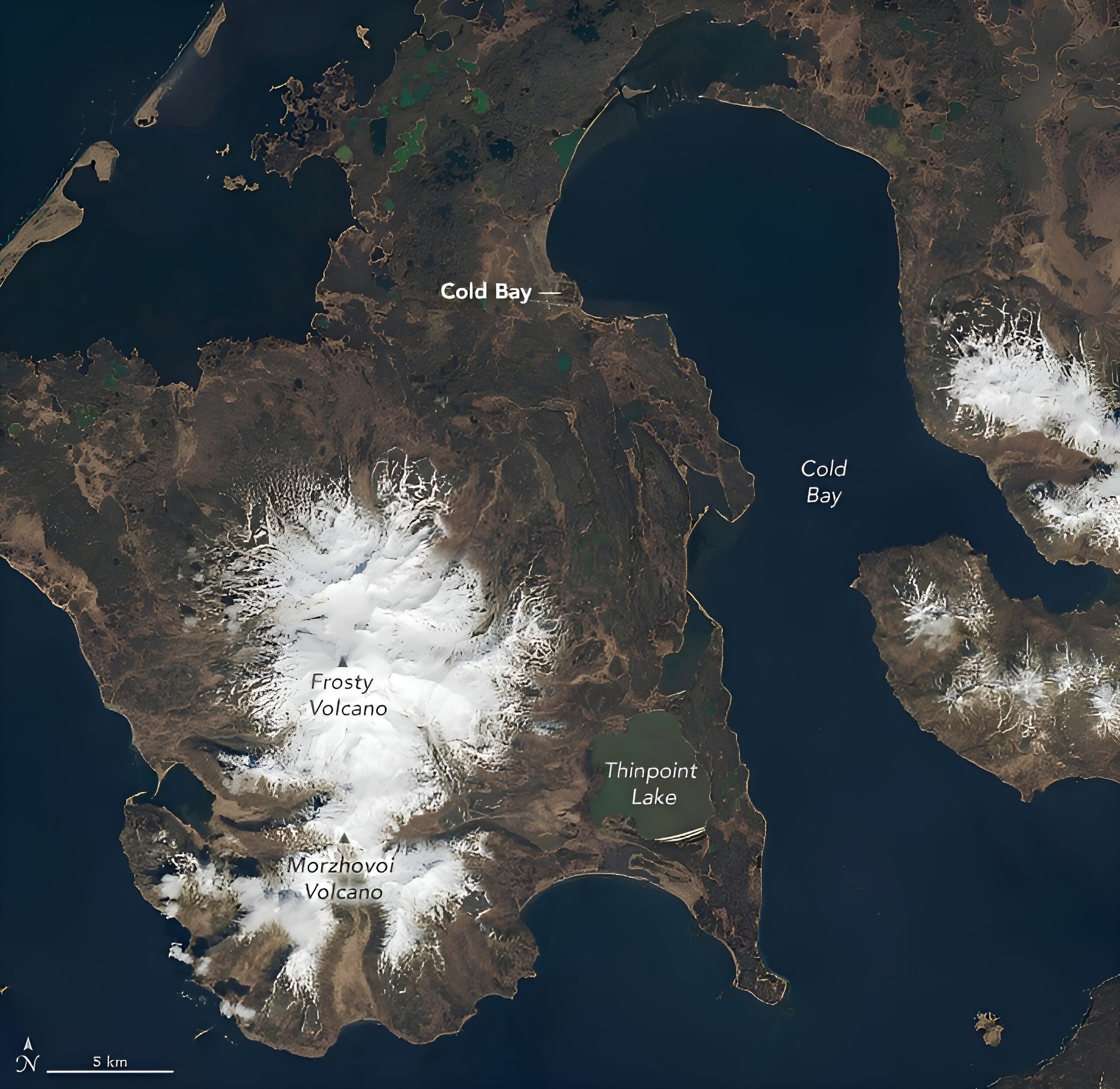 Today’s Image of the Day from NASA Earth Observatory features a stratovolcano in Alaska’s Aleutian Island chain known as Frosty. The photograph shows Frosty’s 5,670-foot peak, with the town of Cold Bay to the north.