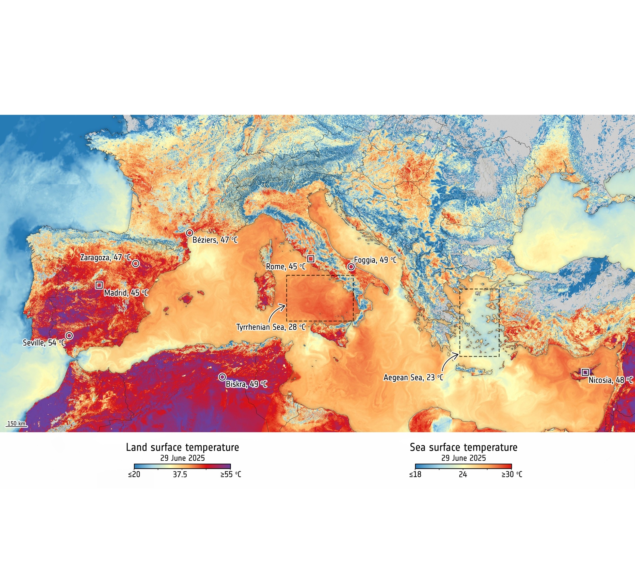 “This image, a mosaic from five overlapping orbital passes in the morning of 29 June 2025, was captured by the Copernicus Sentinel-3 mission’s Sea and Land Surface Temperature Radiometer.”