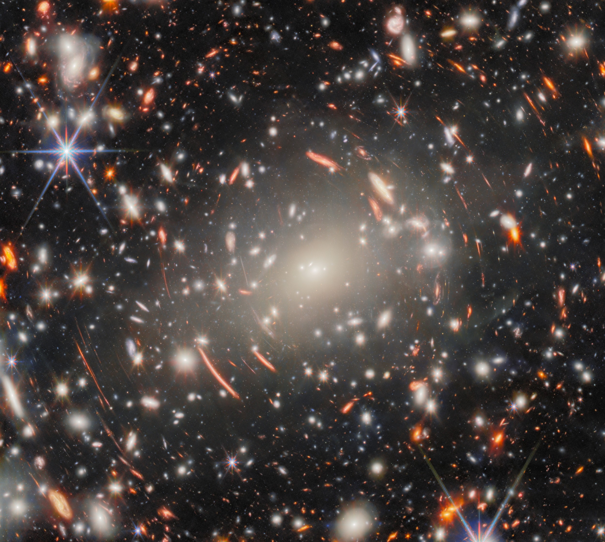 “Looking more closely, this dense collection of heavy galaxies is surrounded by glowing streaks of light, and these warped arcs are the true object of scientists’ interest: faint galaxies from the universe’s distant past.”