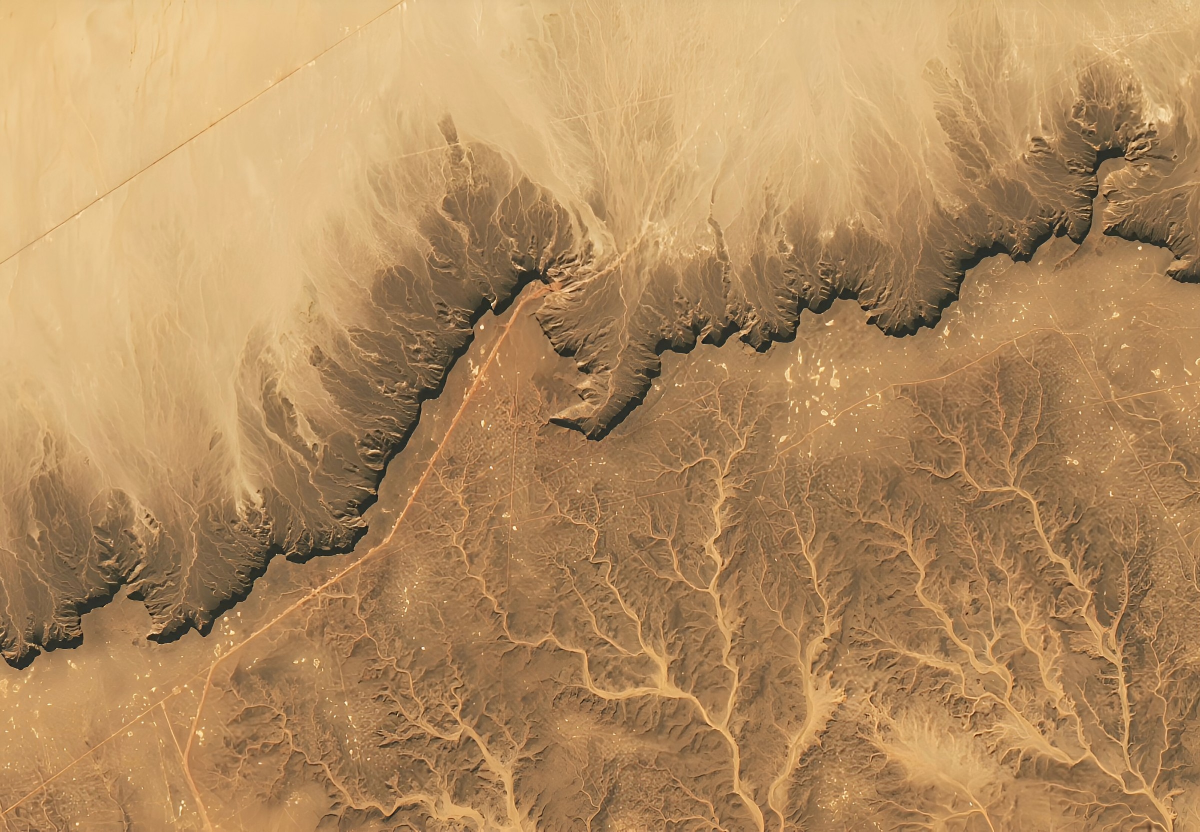 “Deeply incised dried stream valleys, or wadis, crisscross the plateau, indicating significant past water flow. The small, bright features scattered across the plateau are sand and silt deposits left where water once pooled.”