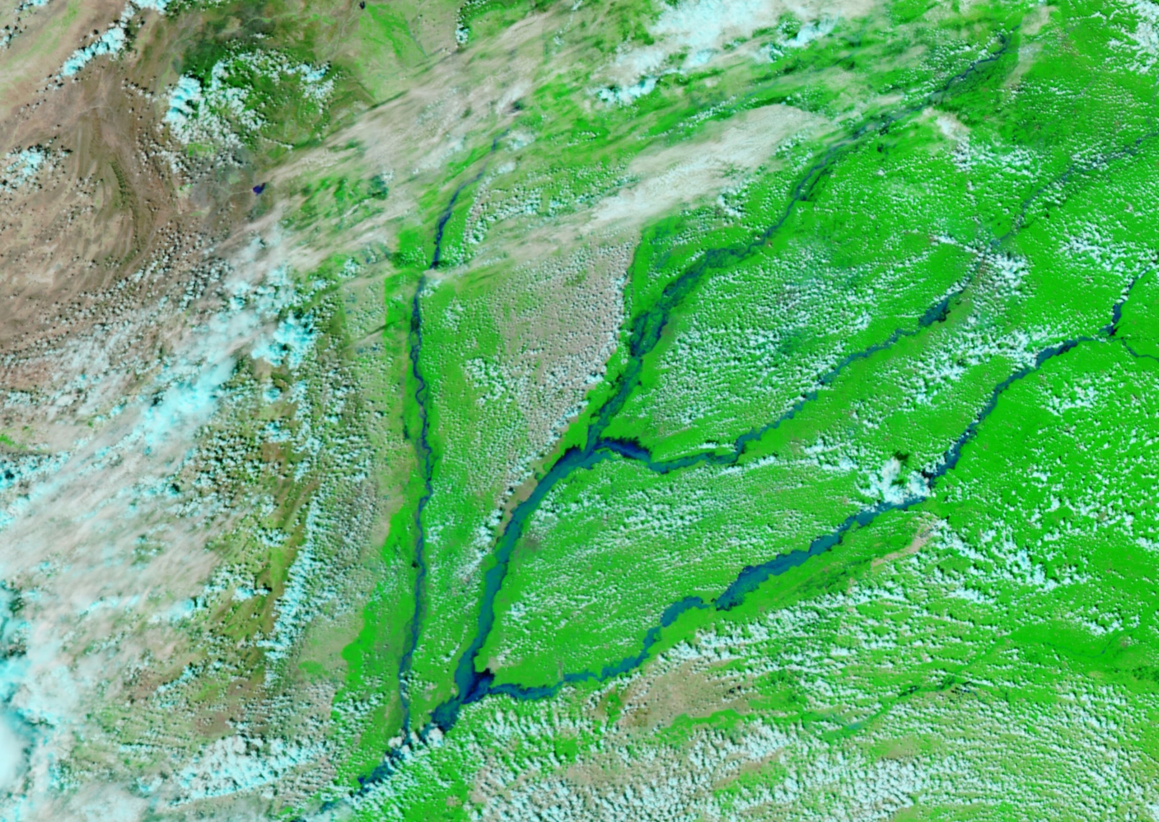 Rivers are indistinguishable from the surrounding countryside, demonstrating just how much territory has been lost to the flood.