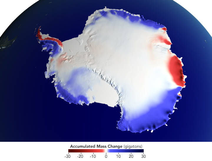 Today’s Image of the Day from NASA Earth Observatory represents an increase in snowfall accumulation over Antarctica during the 20th century, which was estimated to offset global sea level rise by one centimeter.
