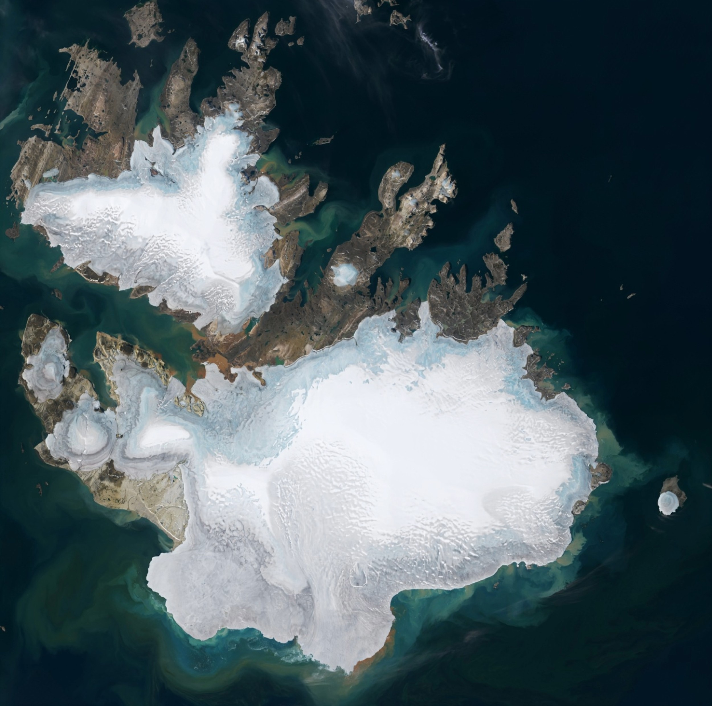 The image is focused on Nordaustlandet – the second largest island in the archipelago. Water and sediment is visibly draining into the Arctic Ocean.