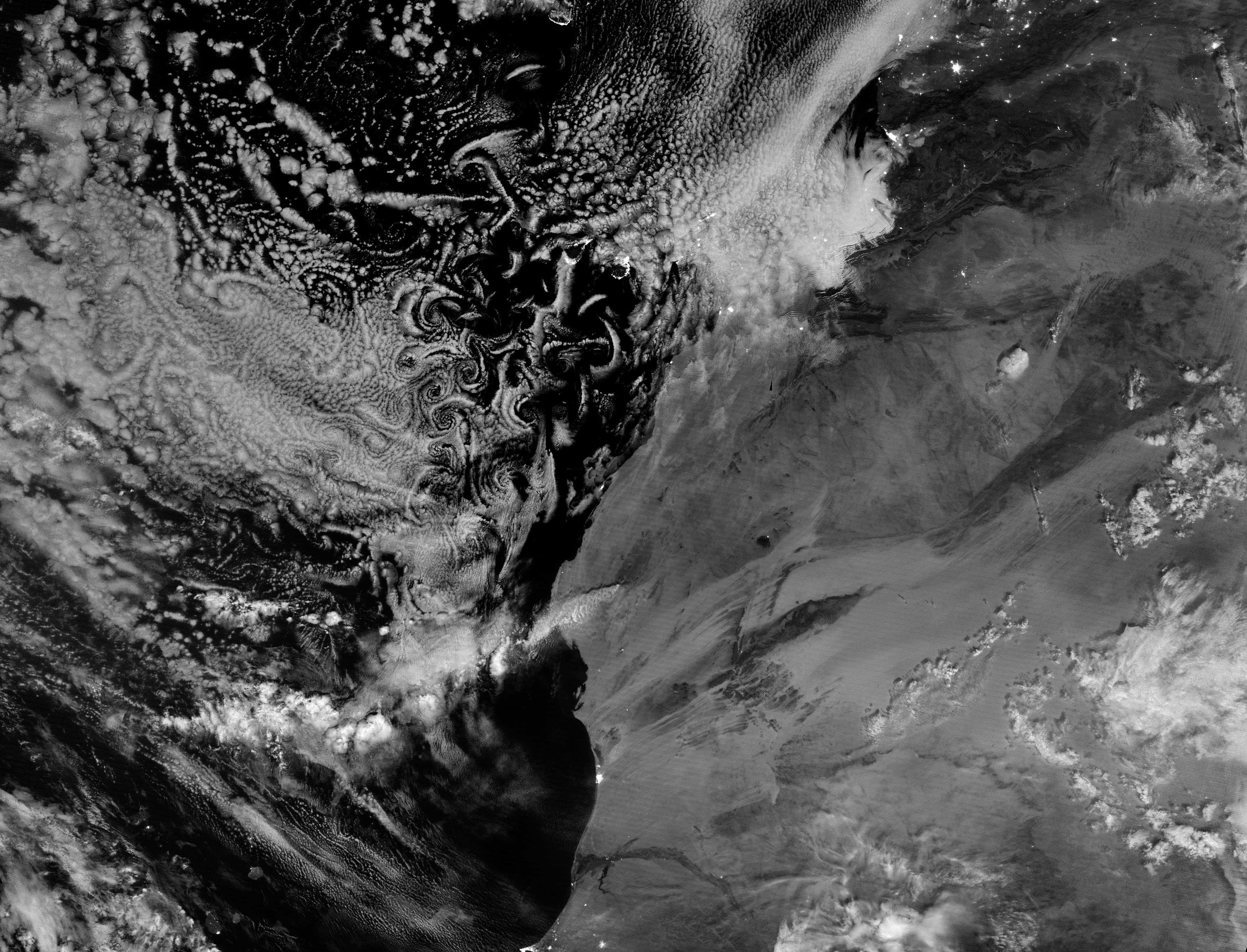 Swirling clouds in the night sky Today’s Image of the Day from NASA Earth Observatory features swirling cloud patterns in the night sky over the coast of Morocco.