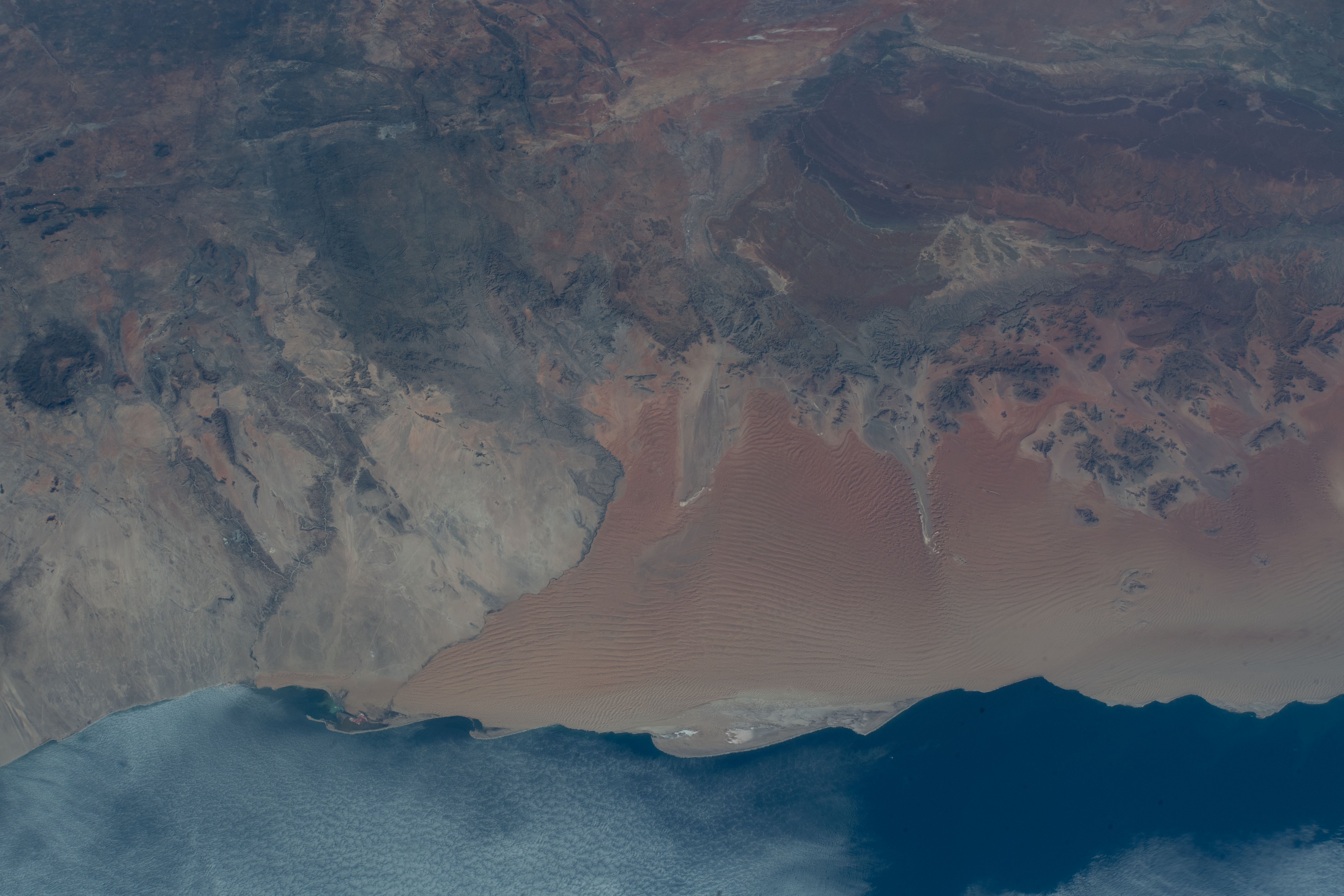The western border of this southern African country is photographed from an altitude of 259 miles, as the International Space Station orbited over the coastline of the Atlantic Ocean.