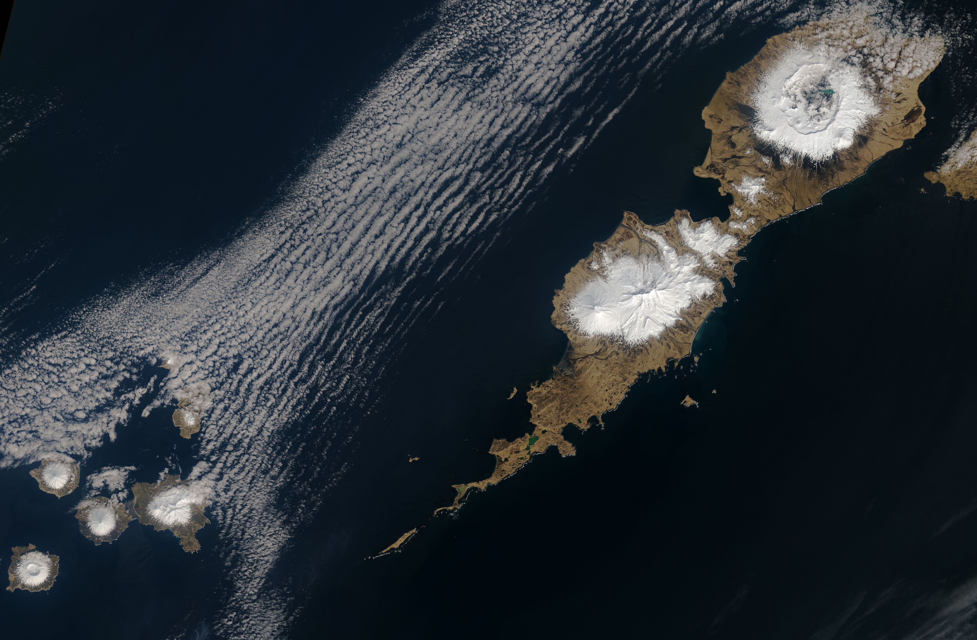 Umnak Island is seen here in the Image of the Day taken by the NASA Earth Observatory. Umnak Island is the third largest in the Aleutian Island chain. The Island is covered in volcanoes, including Mount Okmok on its northern end, which erupted in 2008.