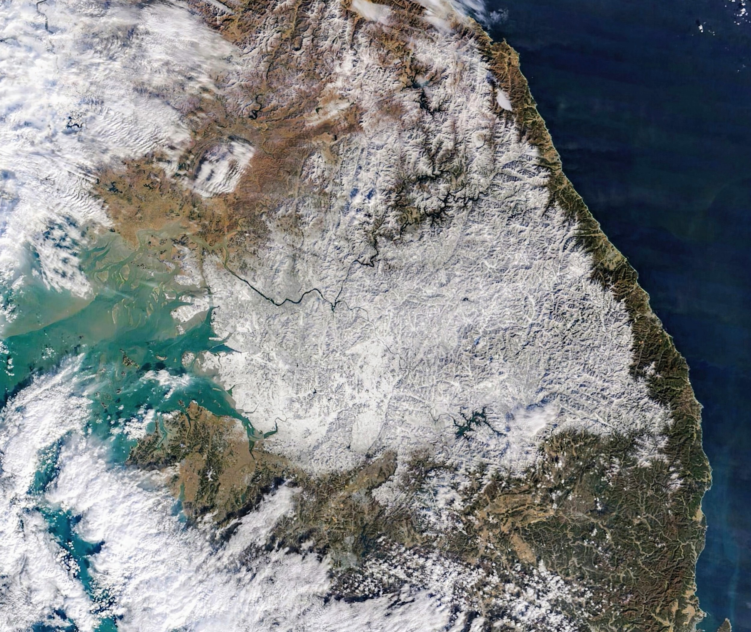“When clouds cleared the following day, the MODIS (Moderate Resolution Imaging Spectroradiometer) on NASA’s Terra satellite captured this image, revealing a broad coating of white across the Korean Peninsula,” said NASA.